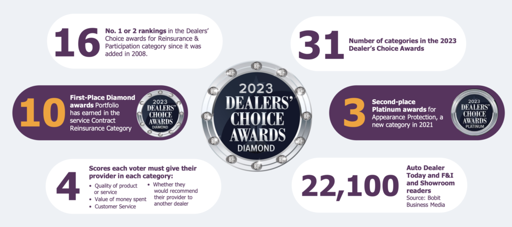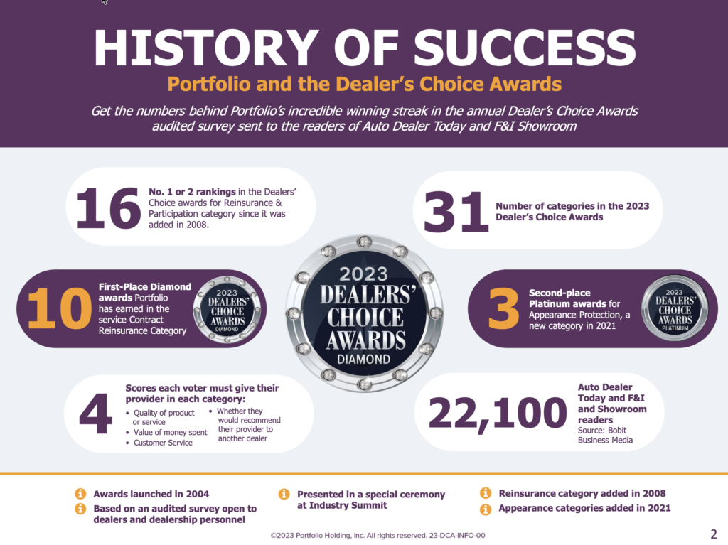 Get the numbers behind Portfolio’s incredible winning streak in the annual Dealer’s Choice Awards audited survey sent to the readers of Auto Dealer Today and F&I Showroom